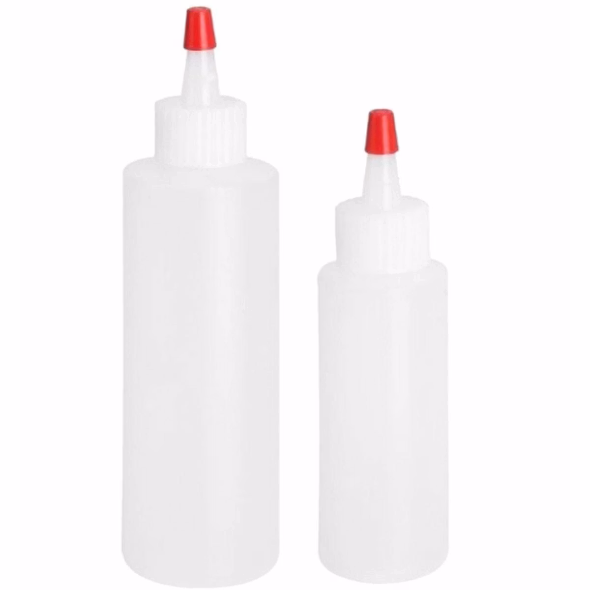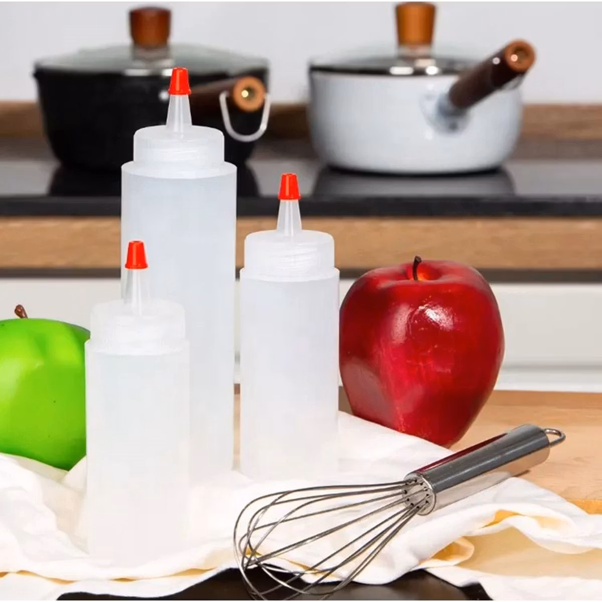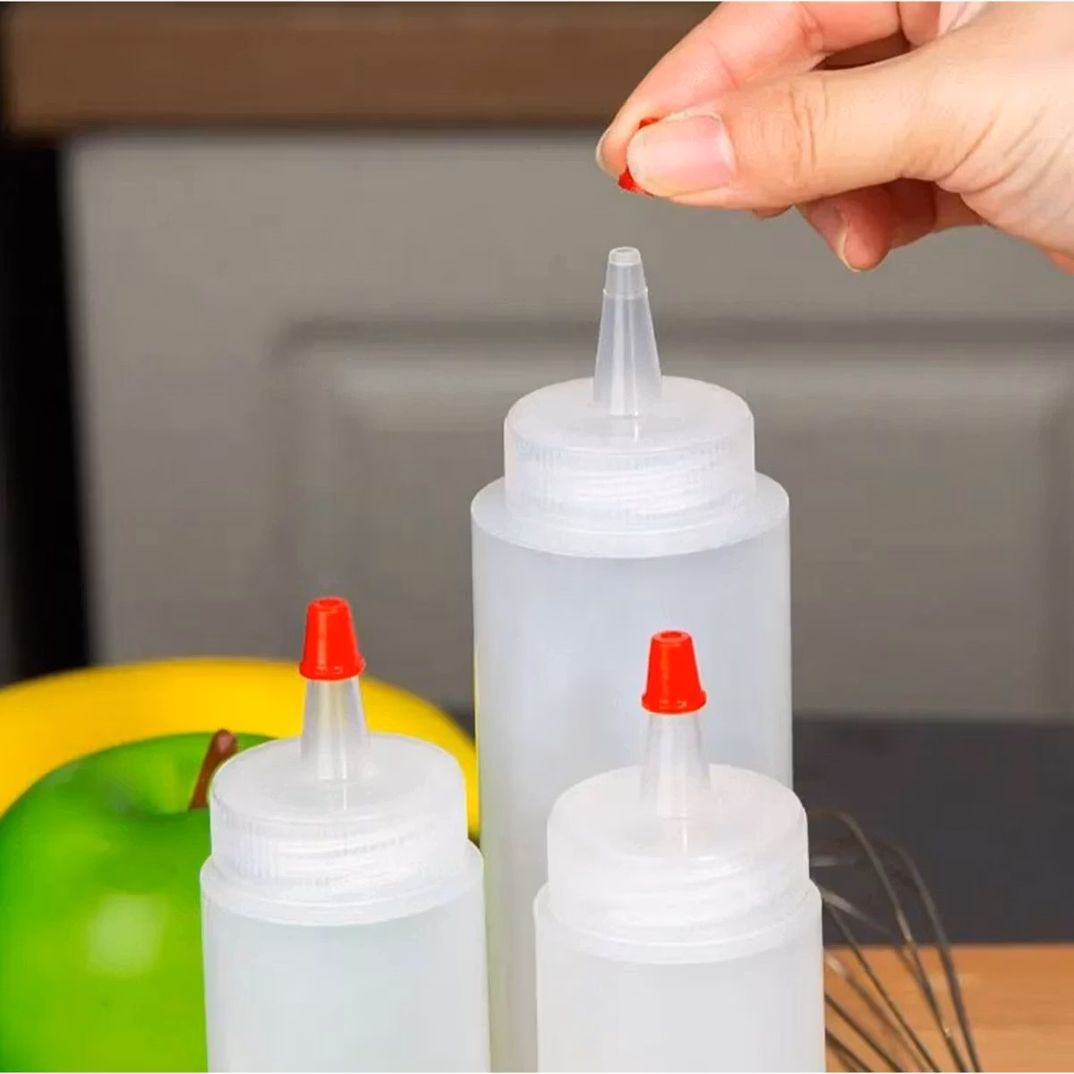 Ett set med två flaskor för att dekorera tårtor etc. Behållare i olika storlekar är perfekta för att dekorera konfektyrprodukter. Flexibel design och smala uttag gör arbetet mycket enklare. Funktionslock förhindrar för tidig torkning av konfektmassan. Tillverkad av solid plast som garanterar lång och problemfri användning.