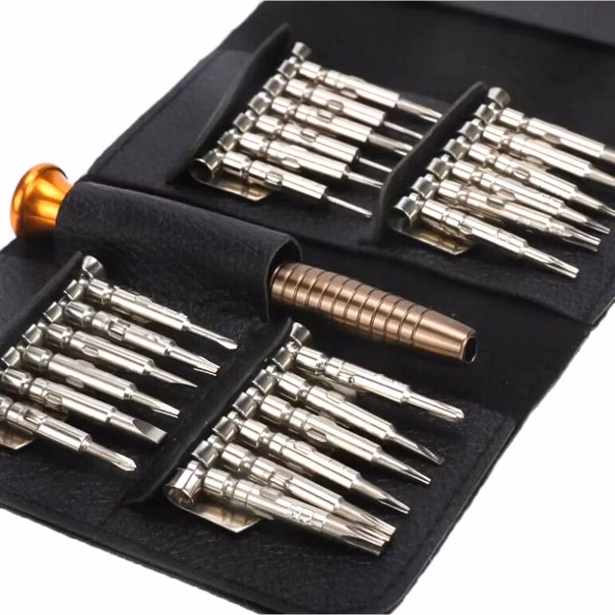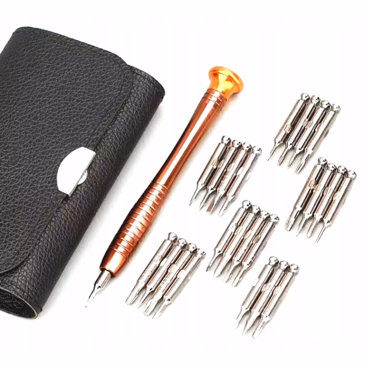 - Setet innehåller så många som 25 olika bitar + skruvmejsel, som är mycket mångsidiga. Spetsarna är gjorda av krom-vanadinstål, vilket gör att de kommer att fungera säkert i många år.
