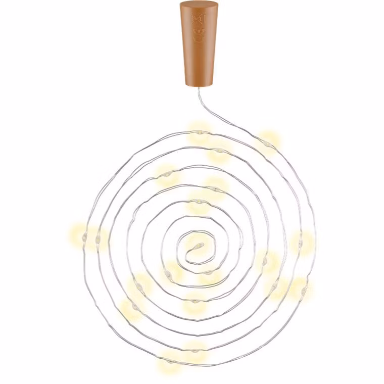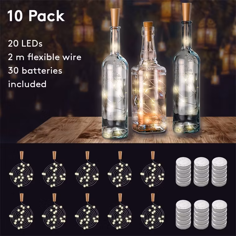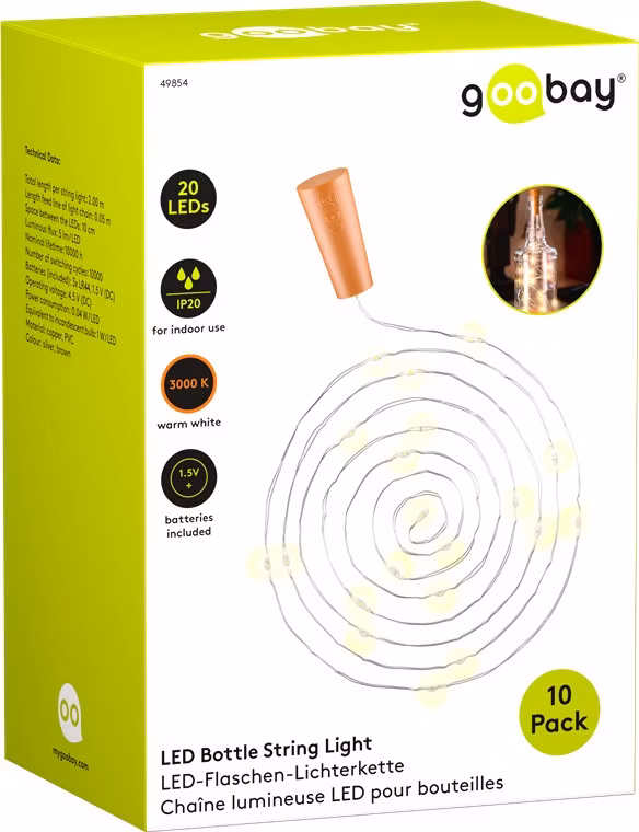 Atmosfärisk belysningsdekoration för glasflaskor. Tio flaskstränglampor med korkar, flexibel tråd och 20 varmvita lysdioder vardera används särskilt för atmosfärisk och dekorativ belysning av glasflaskorlämplig för inomhusbruk (IP20). Batteridriven (3 x LR44 vardera, ingår i leveransen) Material: ca. 0,10 m, total längd: ca. 2,00 m. Lysdioder med 10 cm avstånd från varandra.