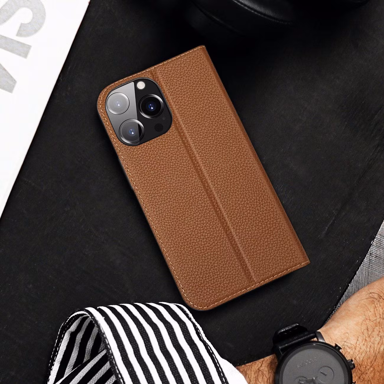 Den bakre delen av klaffen är konstruerad så att den kan fungera som ett stöd för telefonen. Detta är mycket användbart när du vill se en film på din telefon eller ringa ett videosamtal utan att hålla enheten i handen.