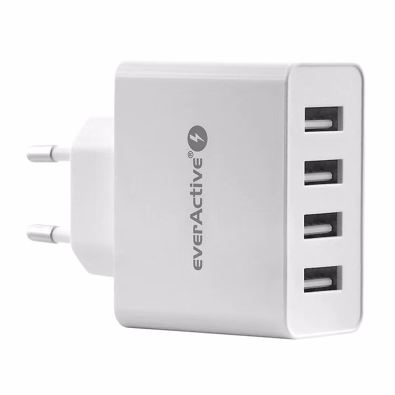 everActive SC-400 är en solid nätverksladdare, utrustad med fyra USB-portar med iQ Smart Charging-teknik. Den är idealisk överallt där antalet eluttag är starkt begränsat och du inte kan använda en vanlig nätverksladdare med en port för att ladda fler enheter samtidigt.