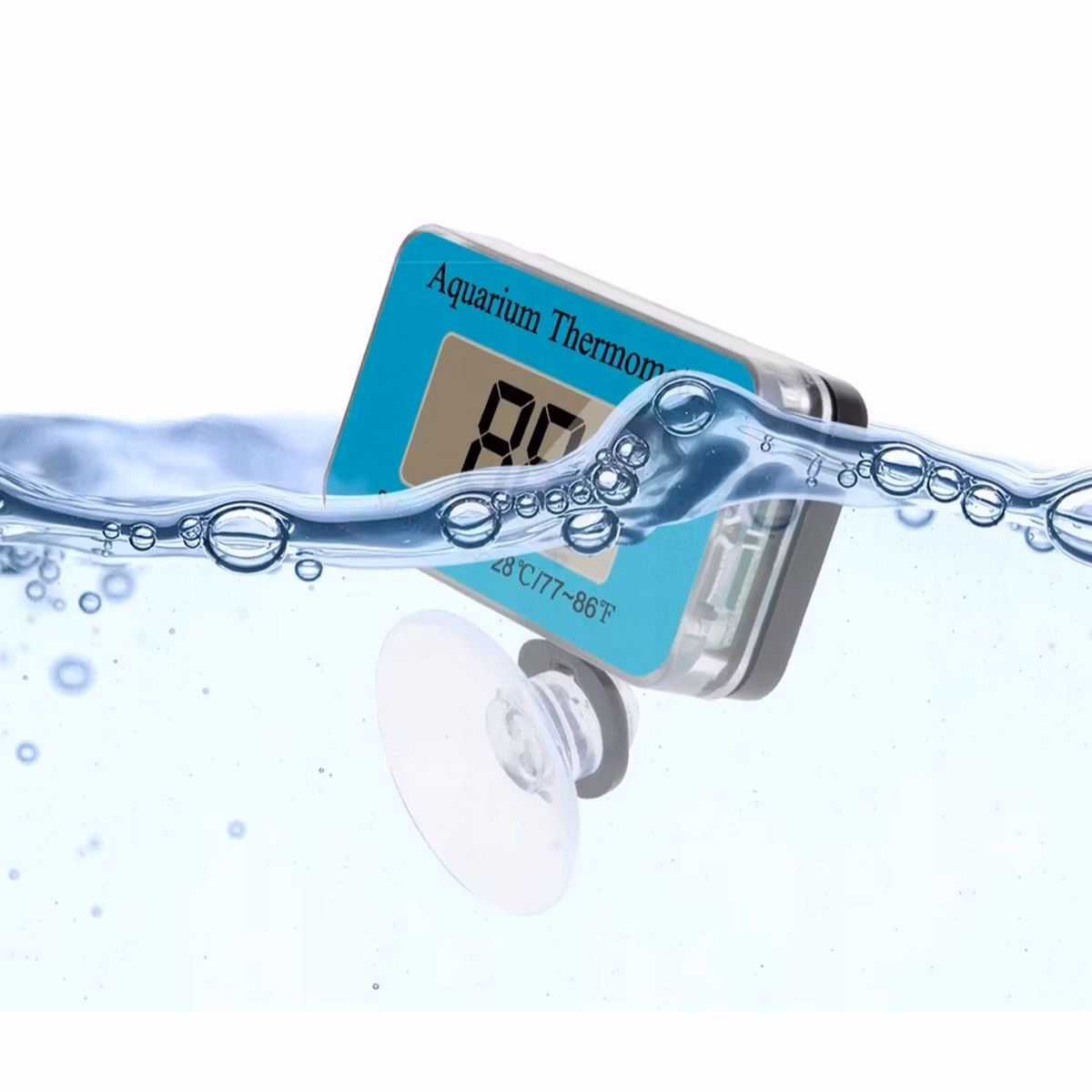 - Den har en inbyggd temperatursensor. Termometern ska fästas på insidan av akvariet med en sugkopp så att den är helt nedsänkt i vattnet.